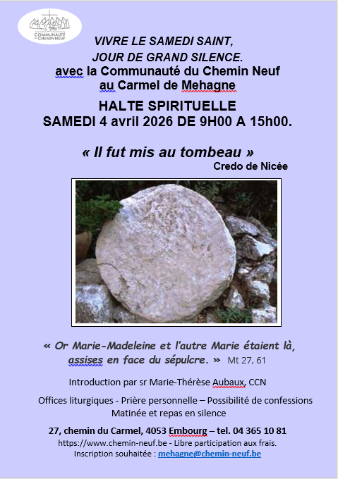 La matinée et le repas sont en silence. Une inscription est souhaitée: mehagne@chemin-neuf.be.